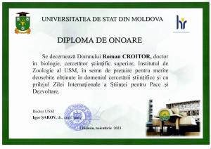 The Performance Gala in Research continued with the handing out of honorary diplomas of MSU, in recognition of special merits in the field of research and on the occasion of the World Science Day for Peace and Development. Among honoured was Dr. Roman Croitor, senior scientific researcher in the Laboratory of Terrestrial Vertebrates, who recently defended his thesis of doctor habilitate at the speciality 165.02. Zoology. We congratulate him and wish him success at the stage of confirmation of the scientific title!