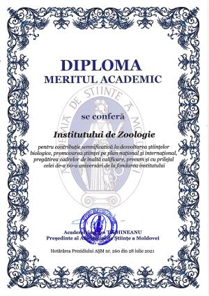 Pentru rezultate marcante în domeniul cercetării și inovării, Institutului de Zoologie i-a fost oferită Diploma „Meritul academic”.