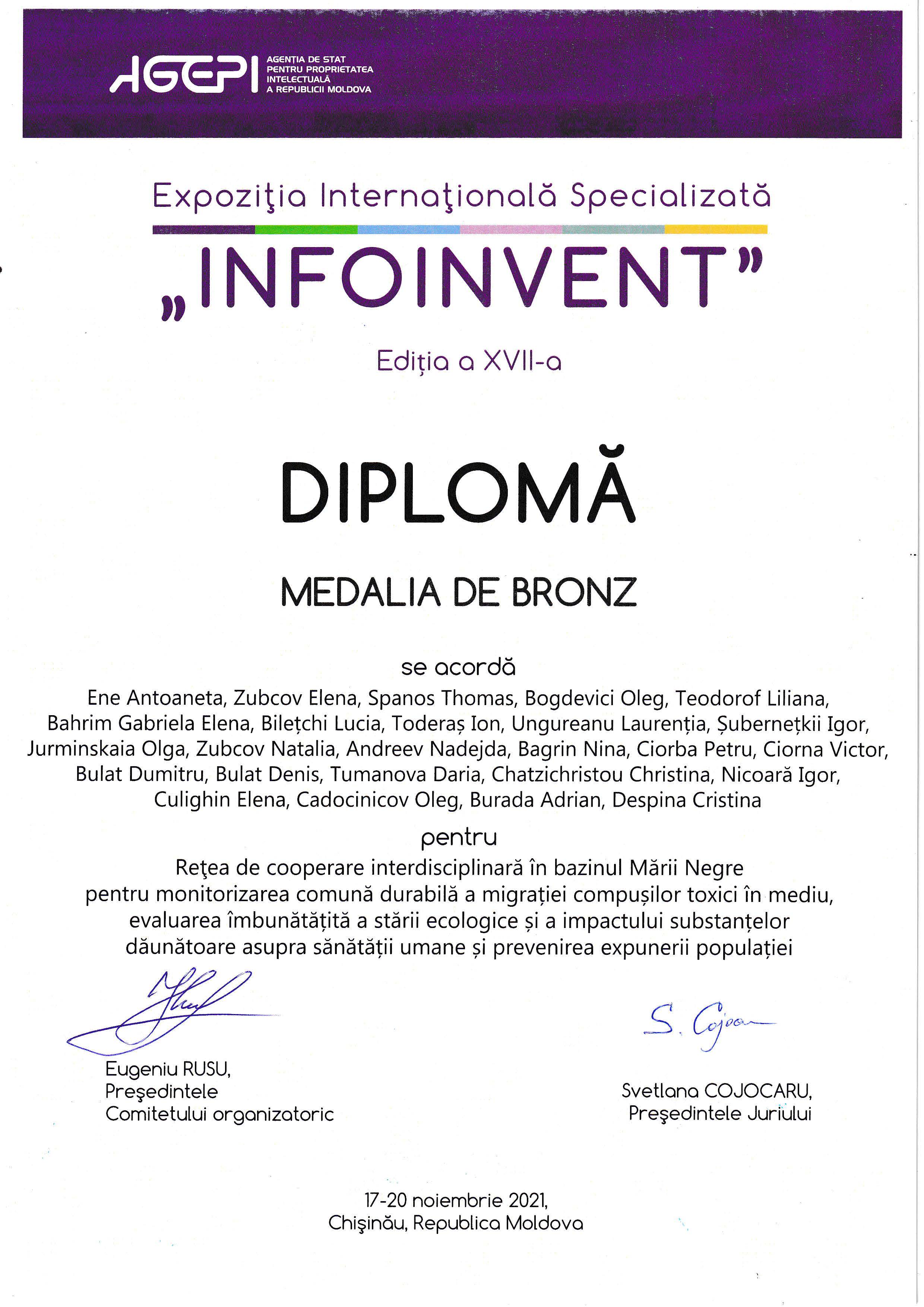 - Reţea de cooperare interdisciplinară în bazinul Mării Negre pentru monitorizarea comună durabilă a migrației compușilor toxici în mediu, evaluarea îmbunătățită a stării ecologice și a impactului substanțelor dăunătoare asupra sănătății umane, și prevenirea expunerii populației (echipa proiectului: Ene Antoaneta, Zubcov Elena, Spanos Thomas, Bogdevici Oleg, Teodorof Liliana, Bahrim Gabriela Elena, Bileţchi Lucia, Toderaș Ion, Ungureanu Laurenţia, Șuberneţkii Igor, Jurminskaia Olga, Zubcov Natalia, Andreev Nadejda, Bagrin Nina, Ciorba Petru, Ciornea Victor, Bulat Dumitru, Bulat Denis, Tumanova Daria, Chatzichristou Christina, Nicoară Igor, Culighin Elena, Cadocinicov Oleg, Burada Adrian, Despina Cristina) – medalie de bronz.