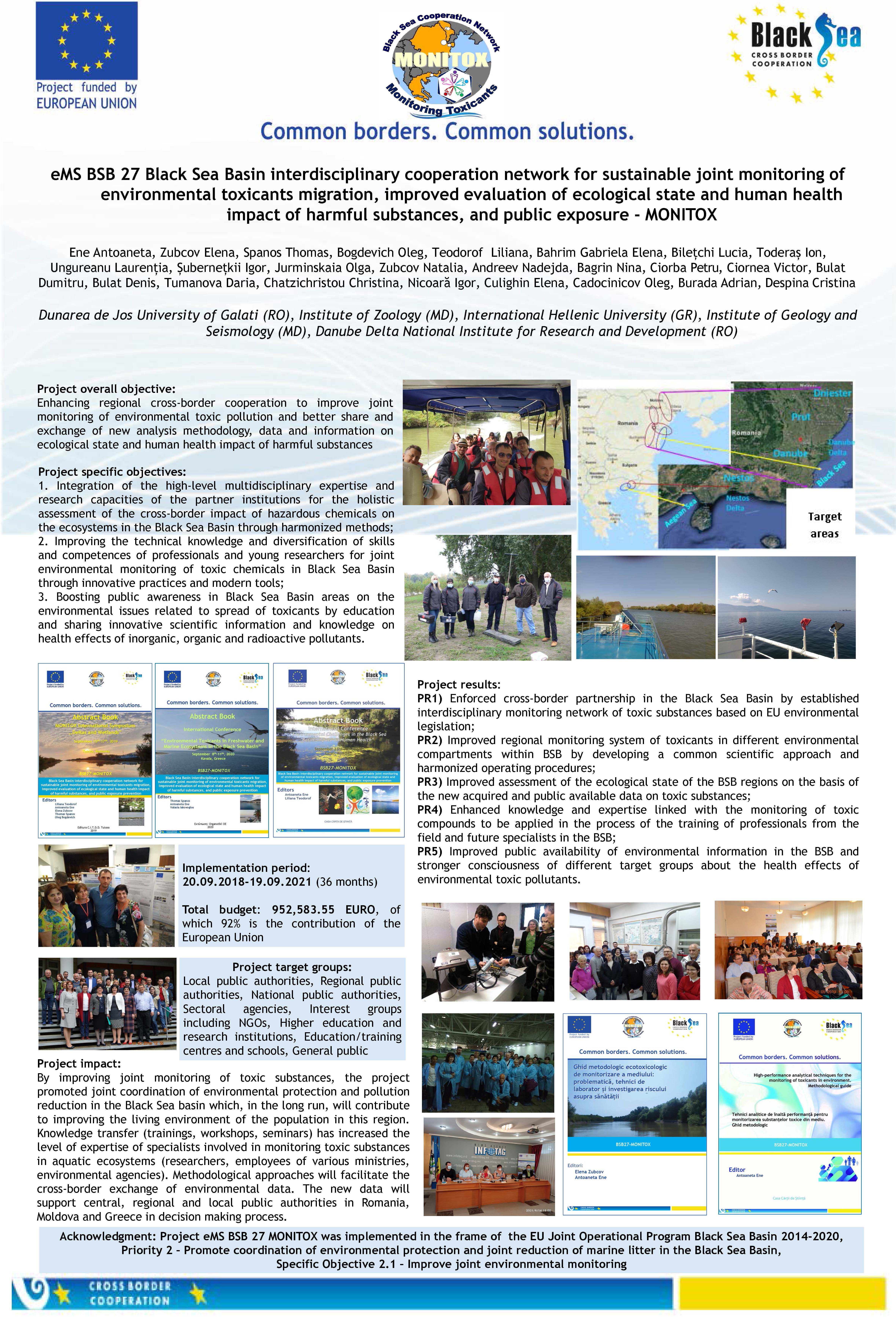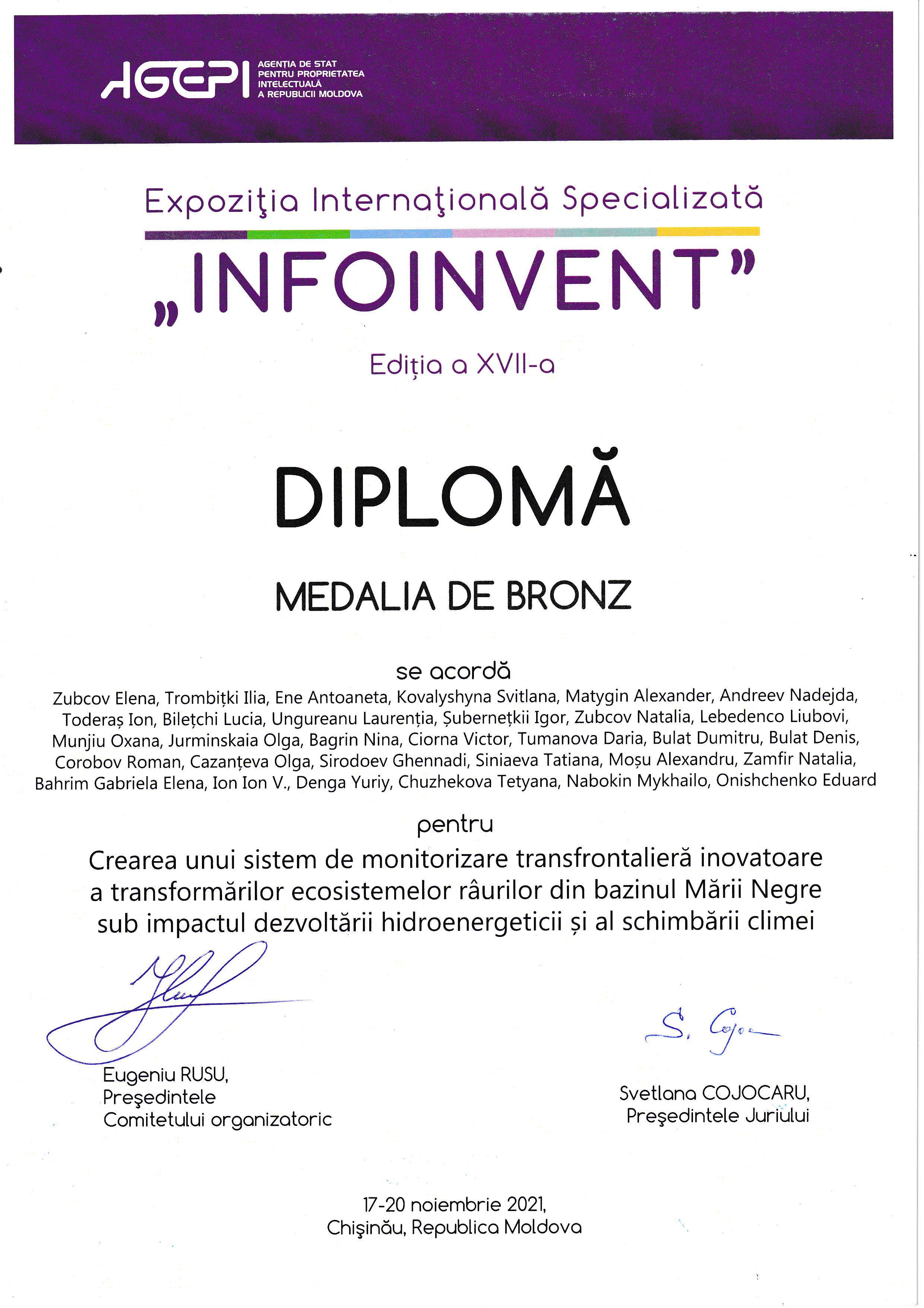 - Crearea unui sistem de monitorizare transfrontalieră inovatoare a transformărilor ecosistemelor râurilor din bazinul Mării Negre sub impactul dezvoltării hidroenergeticii și al schimbării climei (echipa proiectului: Zubcov Elena, Trombiţki Ilia, Ene Antoaneta, Kovalyshyna Svitlana, Matygin Alexander, Andreev Nadejda, Toderaș Ion, Bileţchi Lucia, Ungureanu Laurenţia, Șuberneţkii Igor, Zubcov Natalia, Lebedenco Liubovi, Munjiu Oxana, Jurminskaia Olga, Bagrin Nina, Ciornea Victor, Tumanova Daria, Bulat Dumitru, Bulat Denis, Corobov Roman, Cazanţeva Olga, Sirodoev Ghennadi, Siniaeva Tatiana, Moșu Alexandru, Zamfir Natalia, Bahrim Gabriela Elena, Ion Ion V., Denga Yuriy, Chuzhekova Tetyana, Nabokin Mykhailo, Onishchenko Eduard) – medalie de bronz;