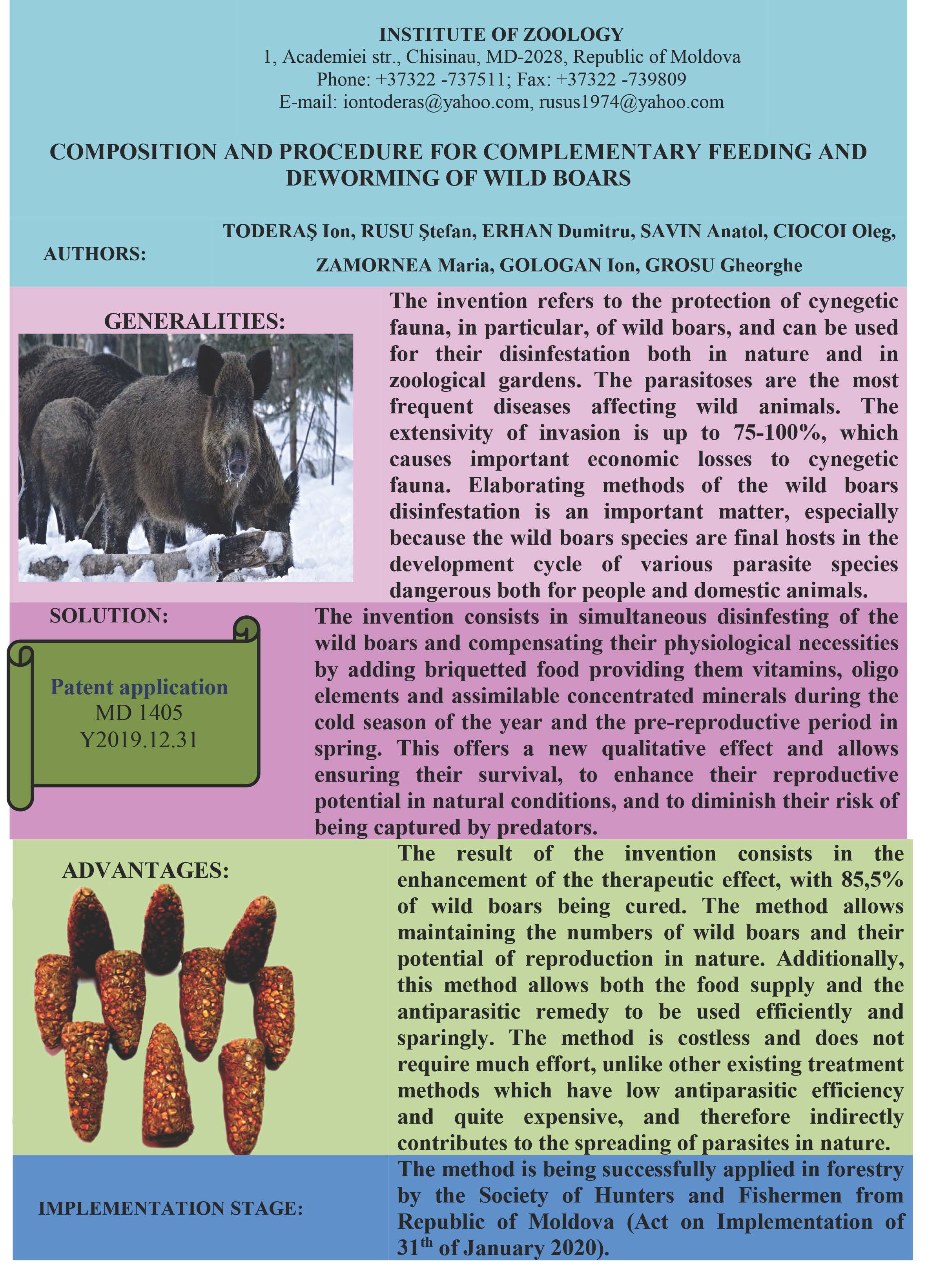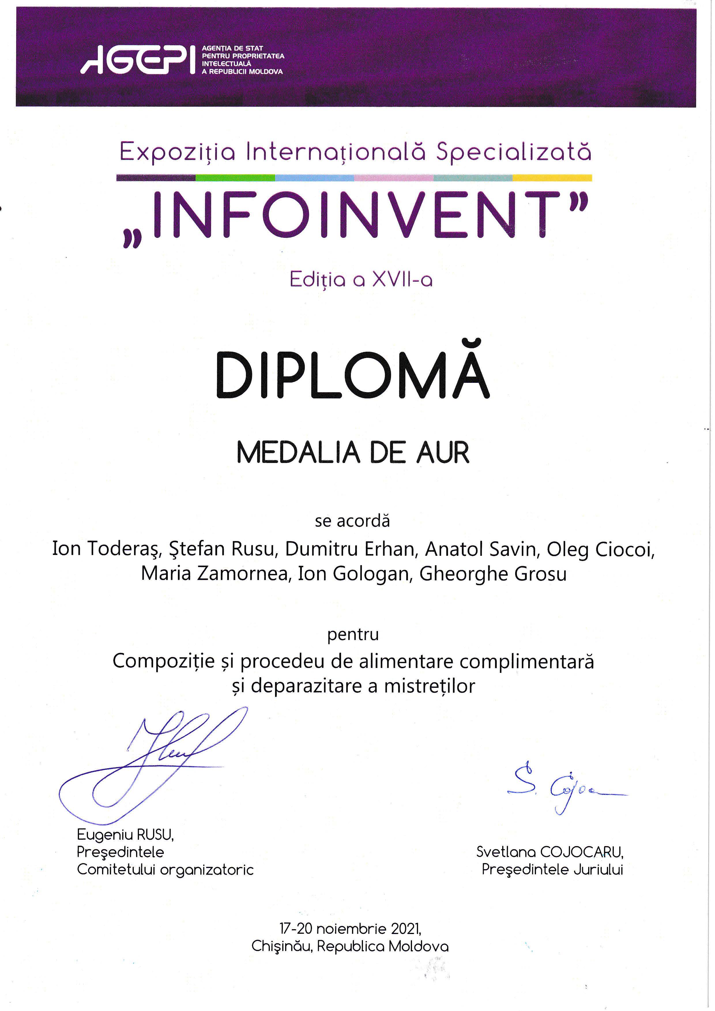 - Compoziție și procedeu de alimentare complimentară și deparazitare a mistreților (autori: Toderaş Ion, Rusu Ştefan, Erhan Dumitru, Savin Anatol, Ciocoi Oleg, Zamornea Maria, Gologan Ion, Grosu Gheorghe) – medalie de aur;