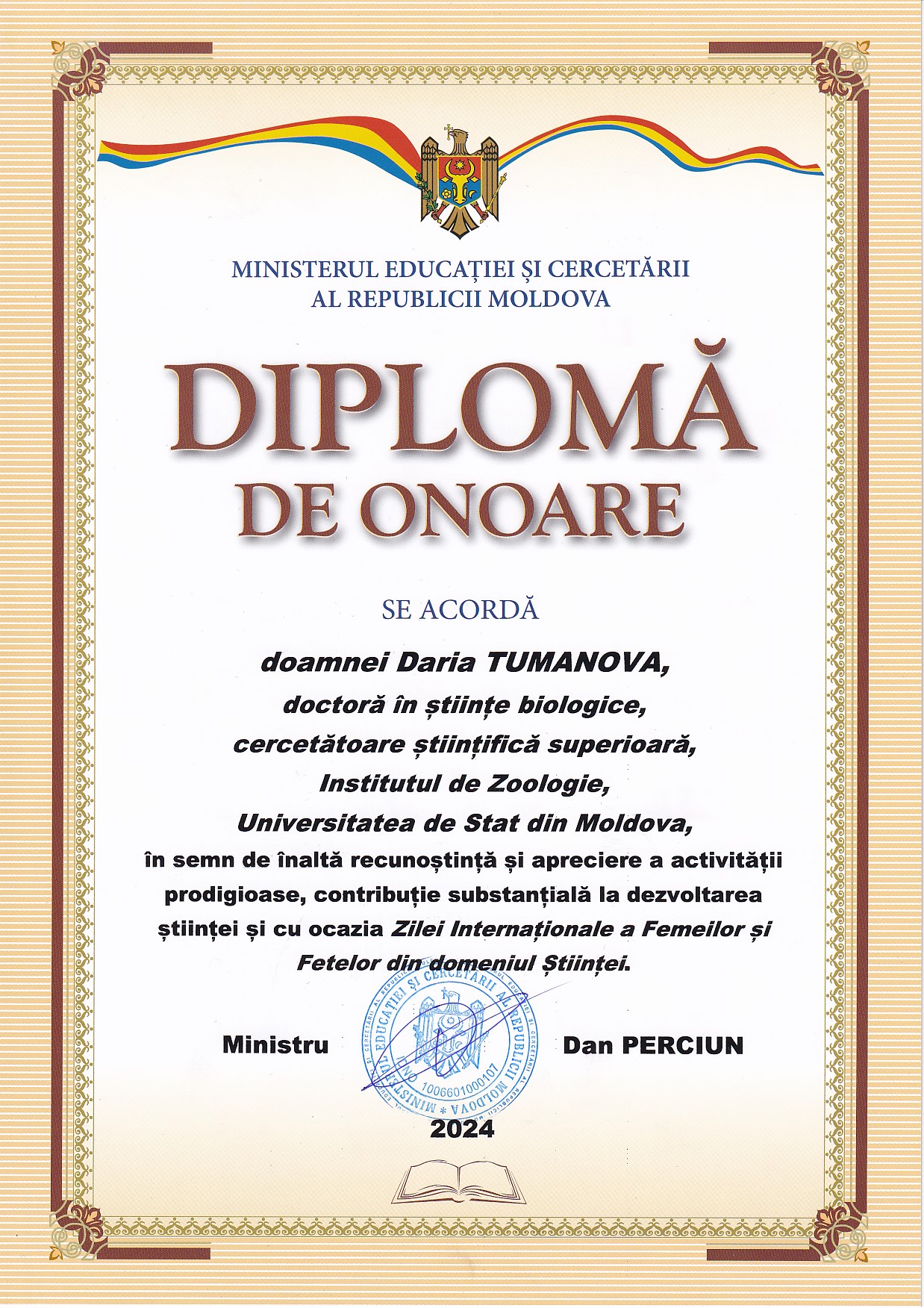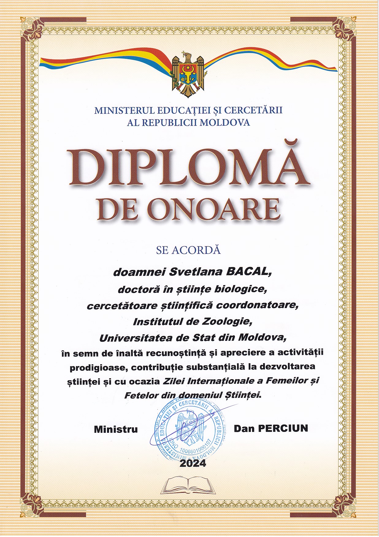 On this occasion, the Ministry of Education and Research of the Republic of Moldova awarded several female researchers with honorary diplomas, including two employees of the Institute of Zoology: